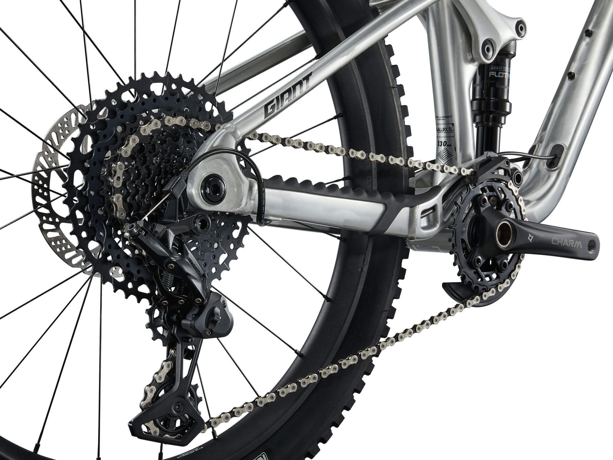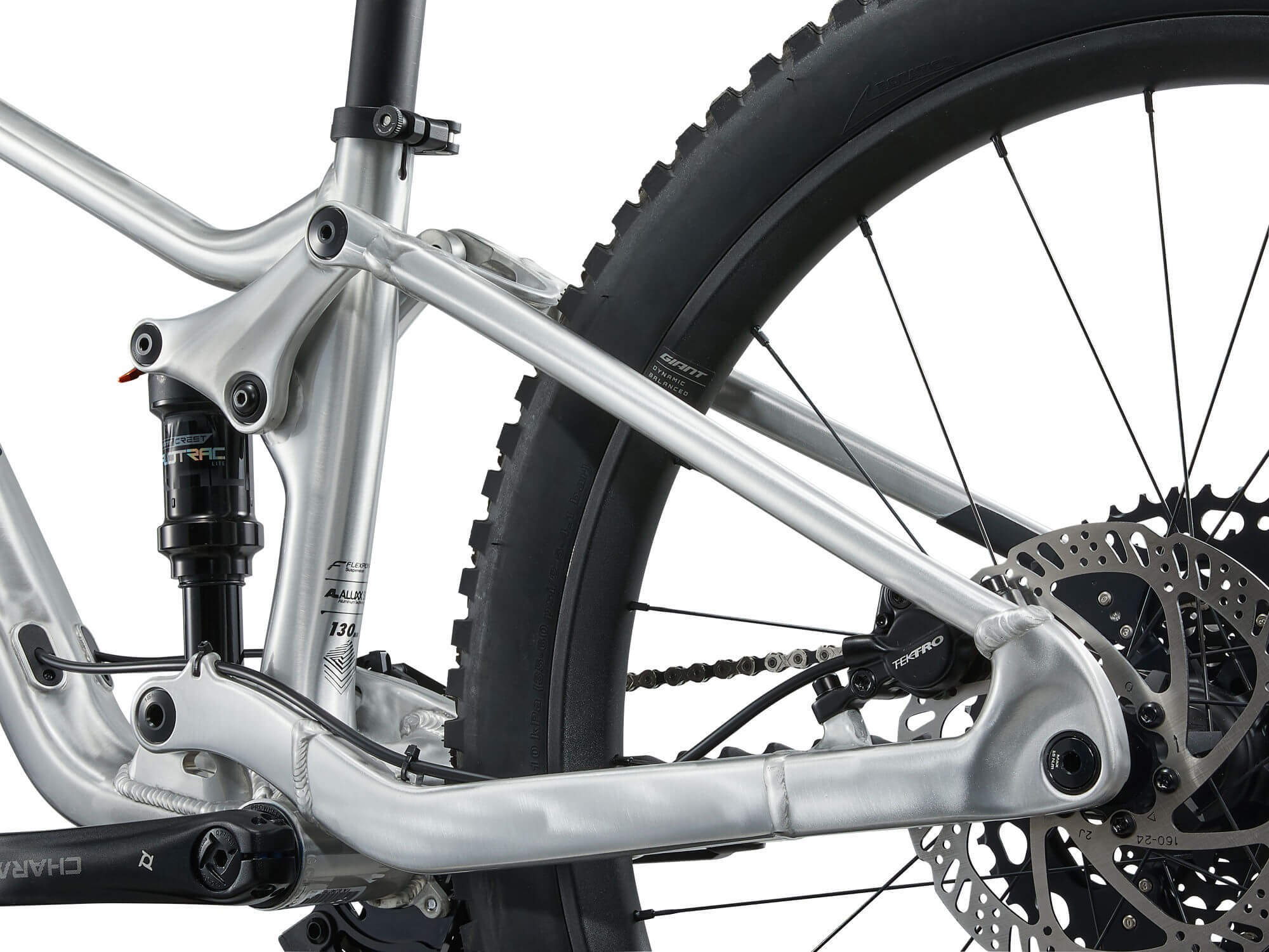 System FlexPoint to lekka konstrukcja zawieszenia z jednym punktem obrotu i sprężystym połączeniem elementów tylnego trójkąta, co daje 130 mm płynnego skoku. Dobrze zestrojony damper Crest FloTrac Lite zapewnia kontrolowaną i aktywną pracę zawieszenia.