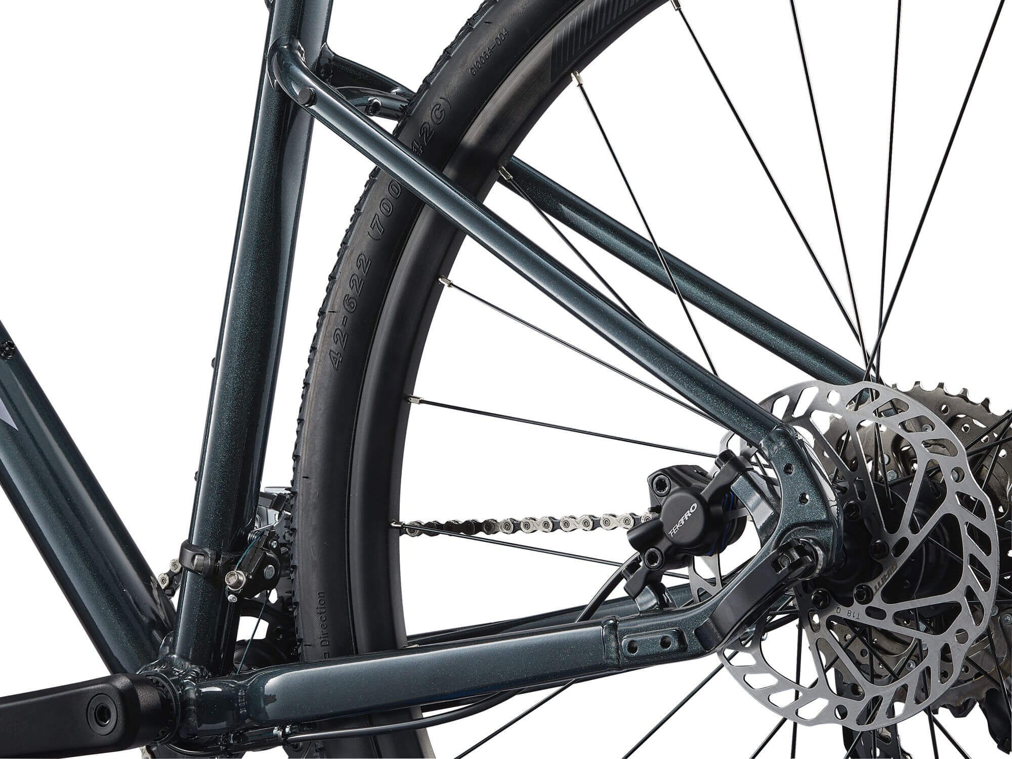 Ulepszona geometria roweru z prostą kierownicą zapewnia rowerzyście pozycję, która równoważy efektywność ze stabilnością, a hamulce tarczowe zapewniają dodatkową kontrolę na nierównych drogach i bezdrożach.